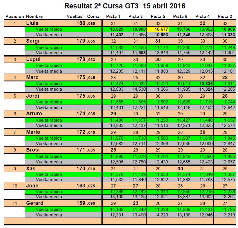 A meitat de cursa el Luis ja havia recuperat el seu handicap, marcant voltes ràpides de 10,9 a tots els carrils, i el Marc decidia canviar el seu cotxe, lo que suposava que no puntuaria a aquesta carrera. A partir d’aquí el Marc volava, igualava el rècord de 32 voltes a un carril del Luis i polvoritzava la seva volta ràpida marcant 10,72 a la pista cinc, recuperant posicions fins a acabar quart de la carrera.