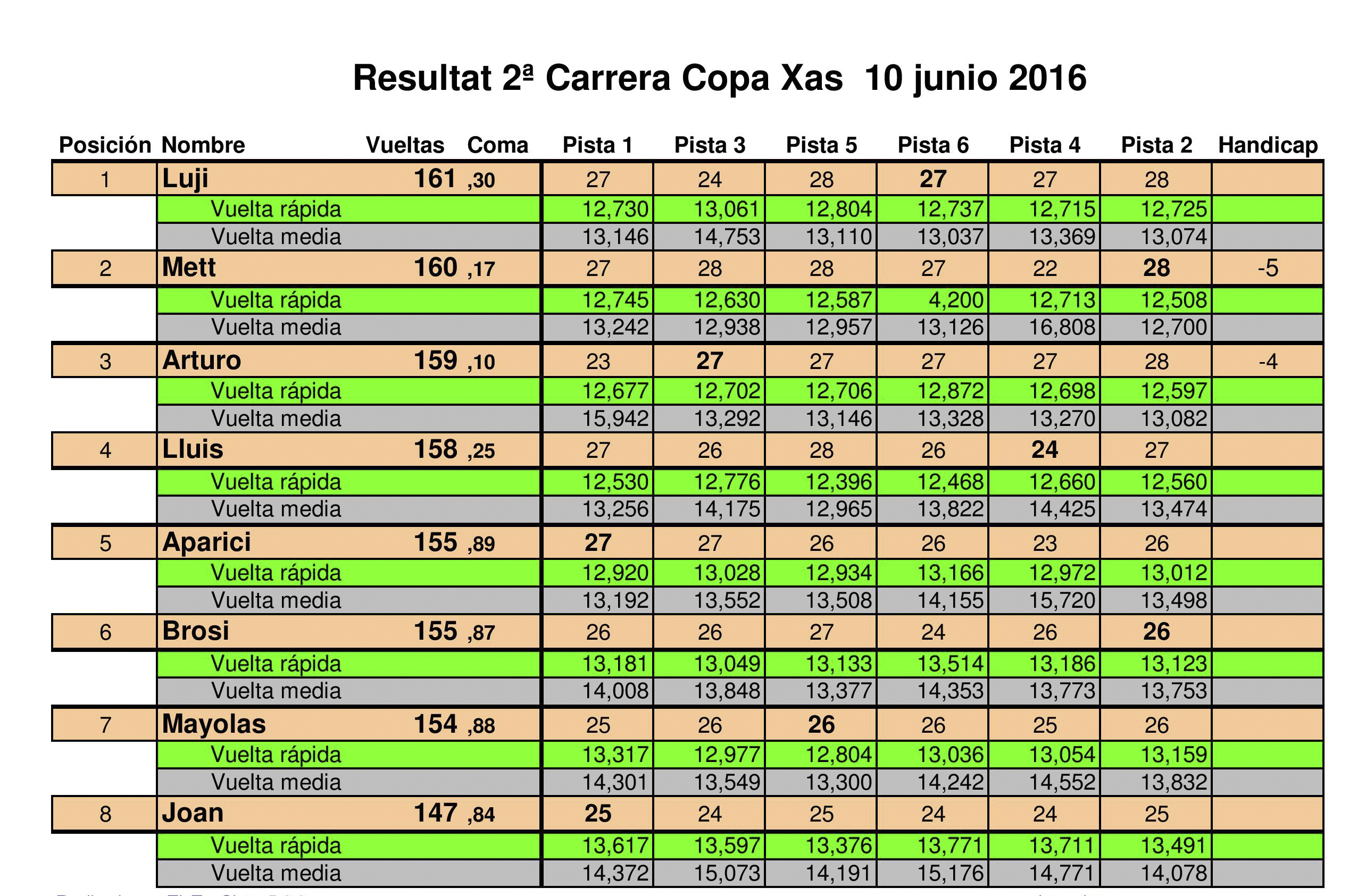 Victoria final, gràcies al hàndicap, per el David Lugilde, que serà quin patirà el hàndicap de cinc voltes a la propera cursa, mentres que el Mett tindrá quatre, Arturo tres, Luis dues i Xavi Aparici una.