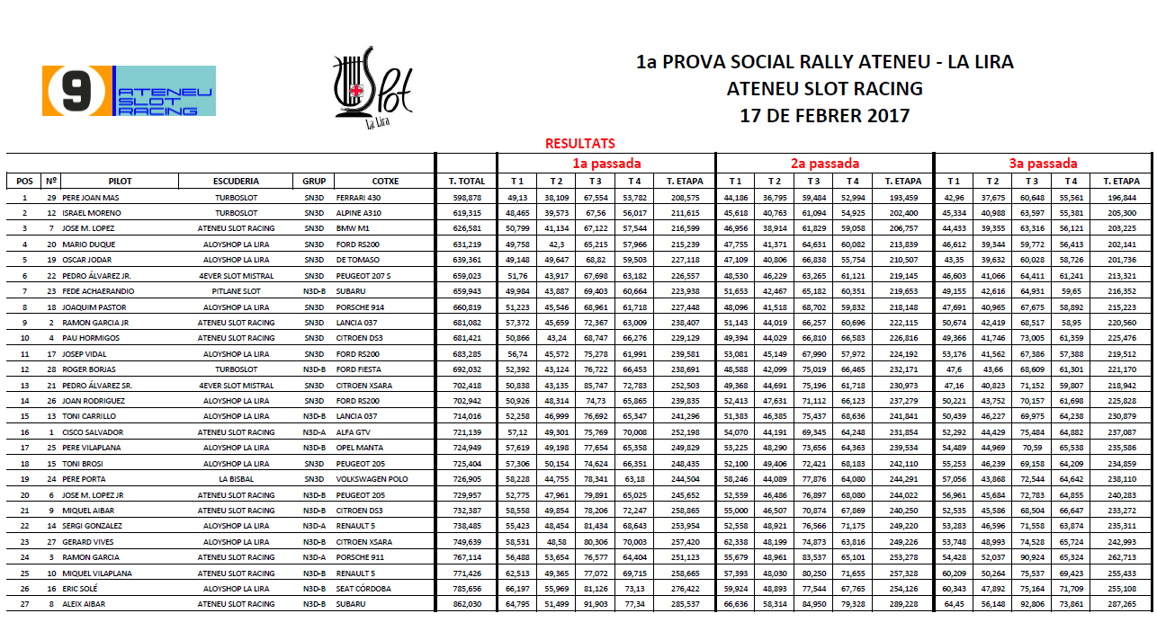 El passat 17 de febrer es va inaugurar el Social de Rally 2017 a l’Ateneu Slot Racing amb 27 inscrits i un bon paper dels pilots de La Lira amb Sergi González fent segon en N3D grup A i Toni Carrillo tercer en N3D grup B.