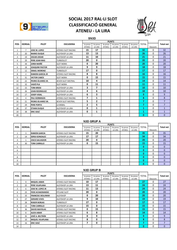 La victoria a la general i a SuperN3D va ser per a Jordi Mañé, de Slot Mora, i el seu Subaru, seguits pel Jose María López, de l’Ateneu, amb BMW M1 i Victor Cabús, també de Slot Mora, amb Peugeot 207. Mario Duque va ser el millor representant de La Lira amb una quarta posició amb Subaru.