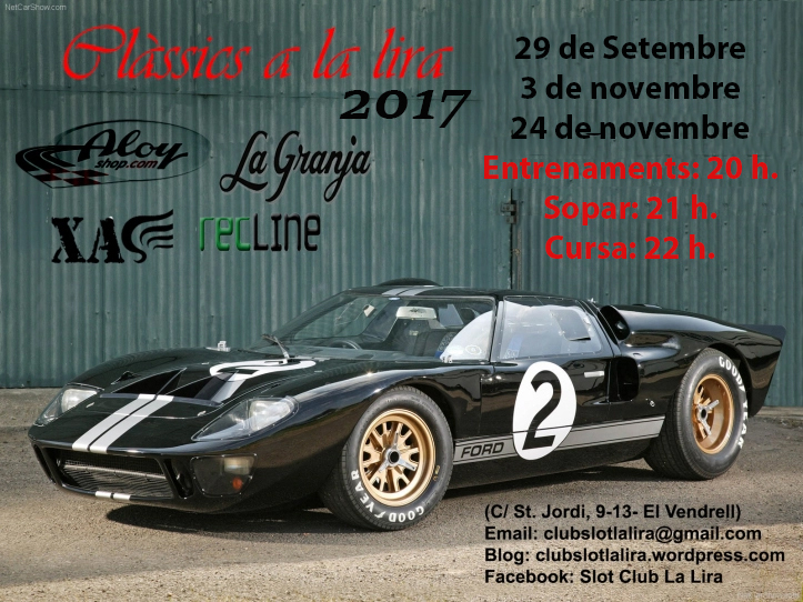 Els clàssics tornan a La Lira amb la primera cursa del quart campionat d’enguany, a disputar el proper divendres 29 de setembre amb els igualats i divertits clàssics de Slot.it. El reglament es el mateix del 2016 i el podeu trobar aquí. Es un reglament molt basic, amb cotxe tot de serie excepte transmisió, lliure amb relació 11/32, i pneumátics, zero grip endavant i Micro-tacs al darrera.