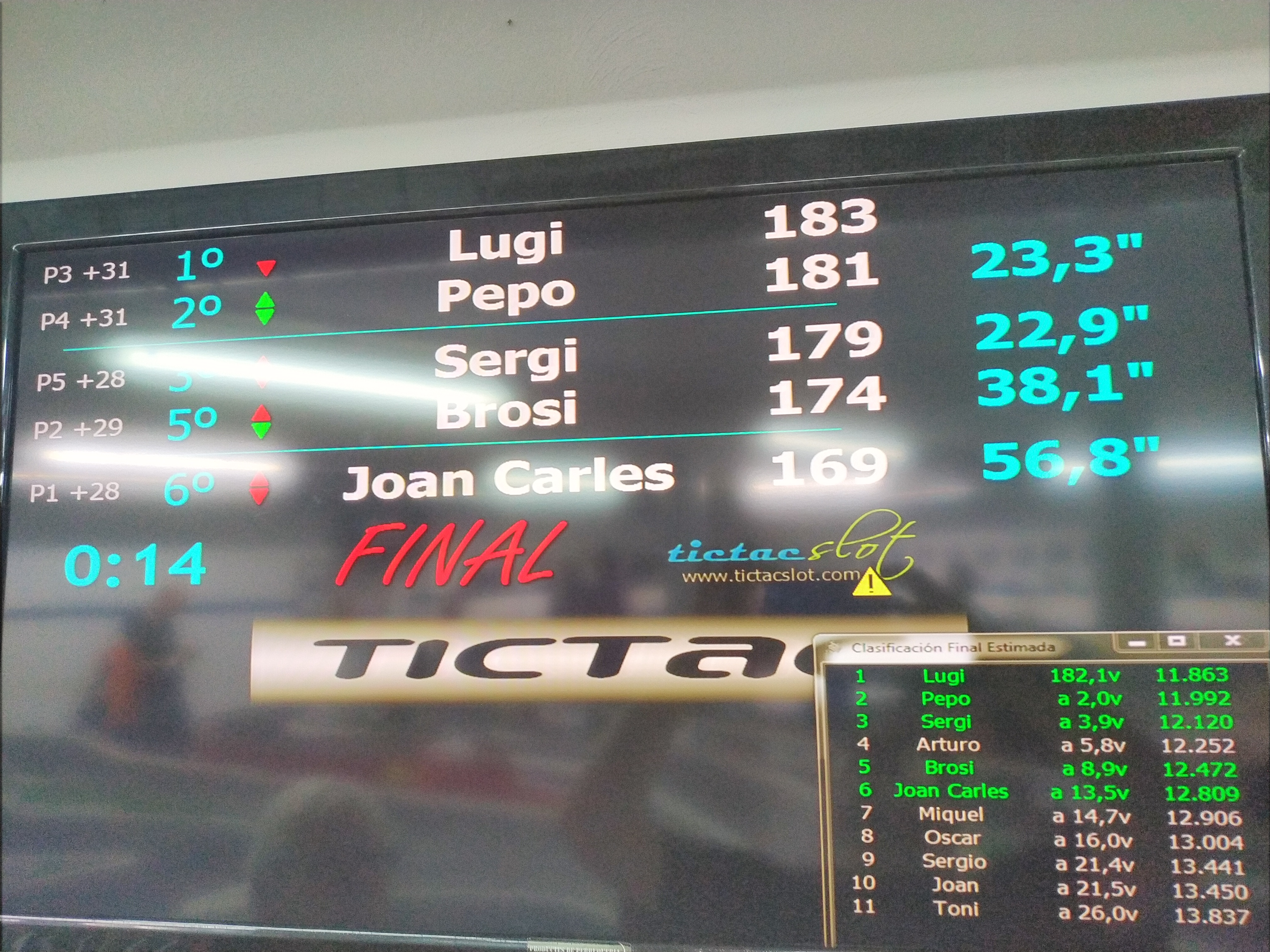 En aquesta segona tanda ja es va veure que els dos primers feien una cursa a part de la resta, quedant en primer lloc el Lugi hi ha només dues voltes el Pepo, el tercer en la pole i tercer final el pilot Sergi va seguir el ritme dels dos primers però alguna sortida de més que els altres dos el van penalitzar amb una diferència de quatre voltes al final de la cursa. Els pilots Brosi i Joan Carles van acabar la cursa en quarta i cinquena posició que els va valdre per quedar cinquè i sisé finals.