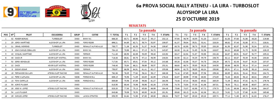8 noviembre, 20198 noviembre, 2019clubslotlalira Crònica: 6ª cursa Social Rallye 2019, La Lira, 25 de Octubre La sisena prova del social de Rallye d’aquest 2019 i ultima del campionat es va disputar a les instal·lacions de La lira el passat 25 de Octubre. Un total de 16 pilots van pendre part en aquesta ultima cursa quedant de la següent manera: Me gusta Cargando... Relacionado